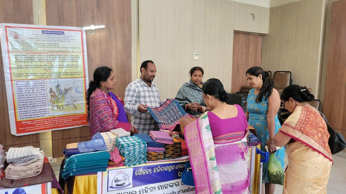 7. On the second component of the strategy related to marketing, SHRADDHA organized a day long handloom sale exhibition in the Banquet Hall pf Royal Lagoon residential complex, Patia, Bhubaneswar, a gated society of over seven hundred high net worth families on the 9th of March 2025. Appreciating the noble purpose, the management volunteered and made their facilities available at a reduced rate. Necessary arrangements for publicity, display, lunch etc. for the participating weavers were made by SHRADDHA. Six weavers from Maniabandha, Gopalpur, Jagatsinghpur and Bargarh handloom clusters participated with a range of handloom products. Smt Snehaprava Dash, an elderly inmate of the complex eagerly came forward to put on a saree with contemporary design woven by the women weavers of Maland village and inaugurated the event. Her gesture and kind words of encouragement generated lots of enthusiasm among the weavers.