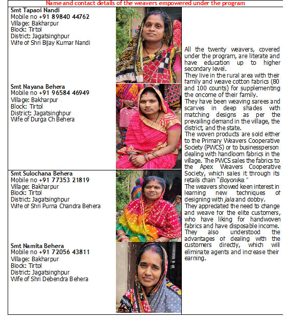 6. The 45-day long training program concluded on the 21st of March 25, within a few days of celebration of the International Women’s Day. Smt Taapoi Nandi and Smt Lovabati Sahu, two weavers trained under the project, narrated their experiences of the training. With confidence and pride, they mentioned that support received under the project enabled them to diversify production from saree with traditional designs and color meant for the rural consumers to dress materials and saree with lighter shades and smart designs for the new generation customers and that this led to increasing their earnings by about 50%.