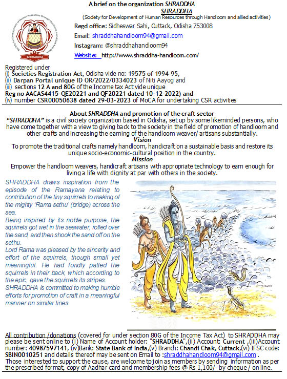 2. In this background, SHRADDHA civil society organisation (founded in 1994 by Dr Sanjay Kumar Panda IAS retired, former Secretary, Ministry of Textile) has been working for promotion of handloom with focus on increasing earnings of the weavers on a long-term and sustainable basis. The organisation was revamped in 2022 with active support of people sharing the common goal of giving back to the society including Shri Bijan Behari Pal (former Director, Weavers Service Centre) and Shri Surendra Kumar Patra (former Deputy Director, Weavers Service Centre), who have decades’ long practical experience and domain knowledge of handloom.